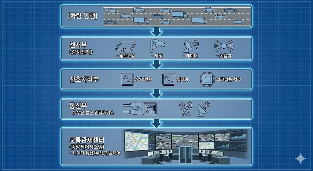 - 센서부에서 감지된 차량정보는 신호처리부에서 디지털화되고, 통신부를 통해 관제센터로 전송되어 교통류 분석 및 신호최적화에 활용