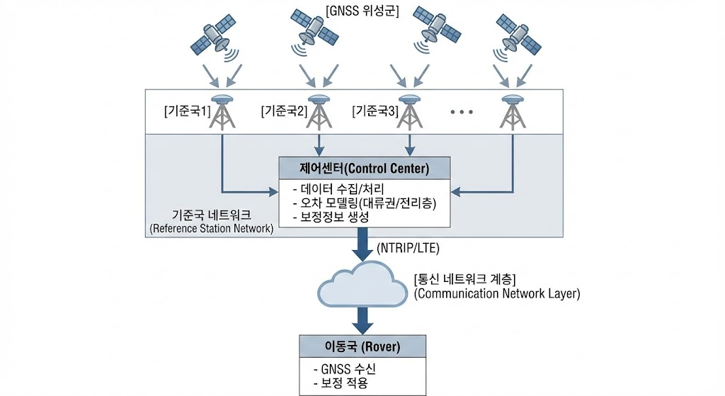 - 단일 기준국 RTK의 거리 제약(10~15km) 극복하고 광역 서비스 제공, 기준국 간 오차 모델링으로 정확도·신뢰성 향상