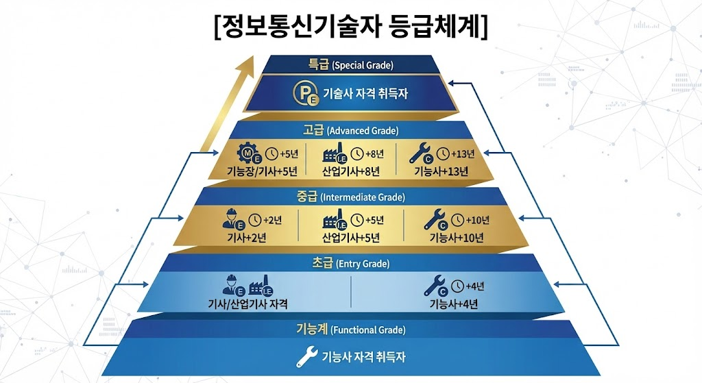 - 학력경력자의 경우 정보통신 관련 박사학위 취득 후 4년, 석사 10년, 학사 13년, 전문대졸 16년 이상 공사업무 수행 시 특급 기술자 인정