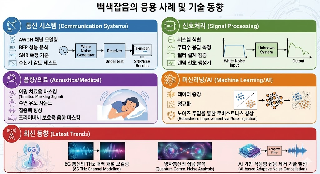 - 통신 시스템 분석, 신호처리, 음향공학 등 다양한 분야에서 기준 신호 및 테스트 신호로 활용되며, 열잡음 등 자연 발생 잡음 모델링에 필수적 개념