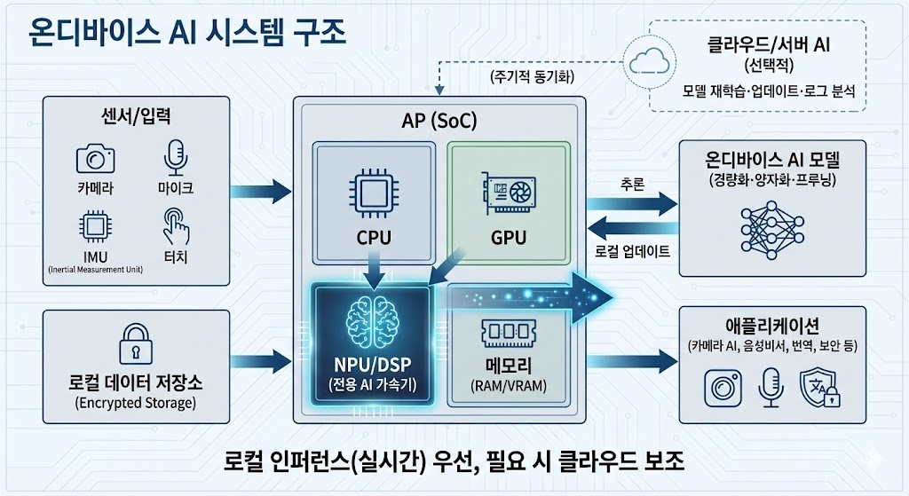 - 온디바이스 AI(On-Device AI)는 데이터 전송 없이 디바이스 내부에서 AI 연산(추론, 일부 학습)을 수행하는 기술로, 클라우드 의존형 AI와 대비되는 엣지 AI 구현 방식임