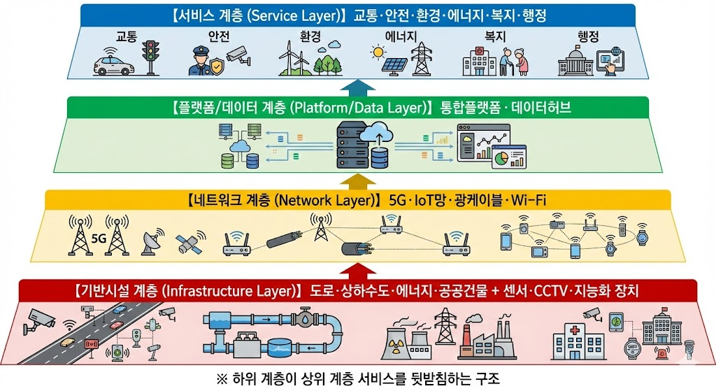 - 스마트도시는 물리적 도시기반시설 위에 디지털 센서망,통신망,플랫폼을 적층한 다층 구조로 구성됨