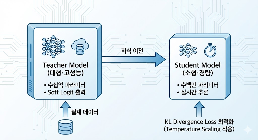 - 사전 학습된 대형 Teacher 모델 → Soft Label(소프트 확률 분포) 생성 → Student 모델 학습에 활용; 단순 정답(Hard Label)이 아닌 모델의 '사고 과정(Dark Knowledge)' 전달