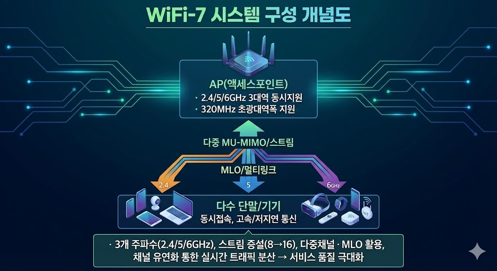 · WiFi-7(IEEE 802.11be)은 2.4/5/6GHz를 활용하고, 320MHz 대역폭, 16x16 다중공간(MIMO), 4K-QAM, 멀티링크(MLO), 프리앰블 펑쳐링 등 기술을 통한 트래픽 분산과 지연 최소화 실현함