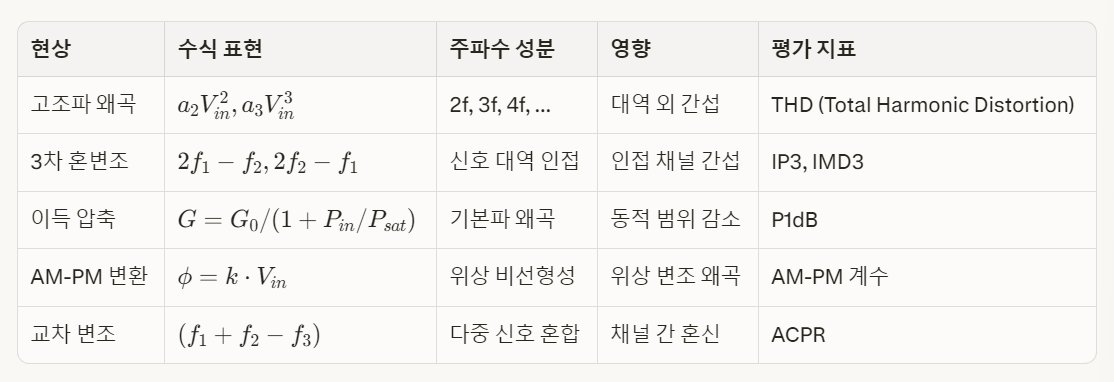 - 출력 Vout=a1Vin+a2Vin2+a3Vin3+⋯ 형태로 표현되며, 2차항은 고조파, 3차항은 혼변조 성분 생성