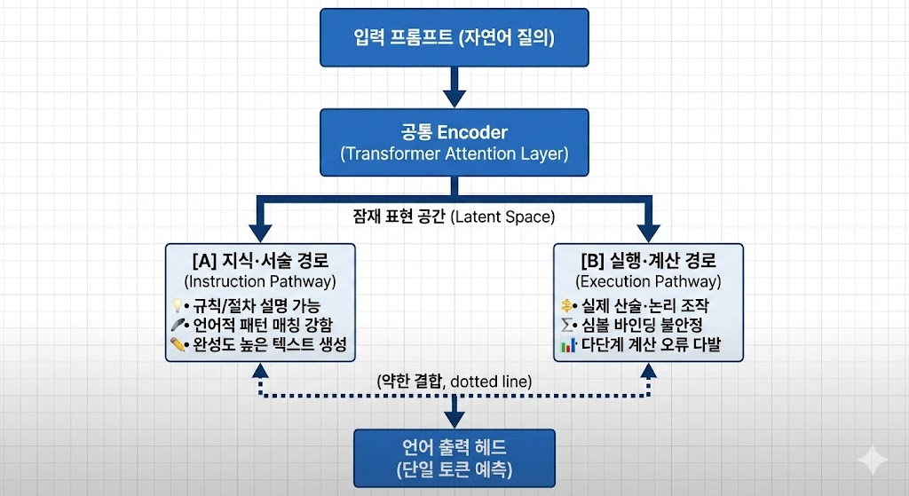 | 정의 | LLM 내부에서 지식 표현 경로(instruction pathway)와 실행 연산 경로(execution pathway)가 기하학적 및 기능적으로 분리되어, 원리 서술은 완벽하나 실제 실행은 불안정하게 나타나는 현상 |