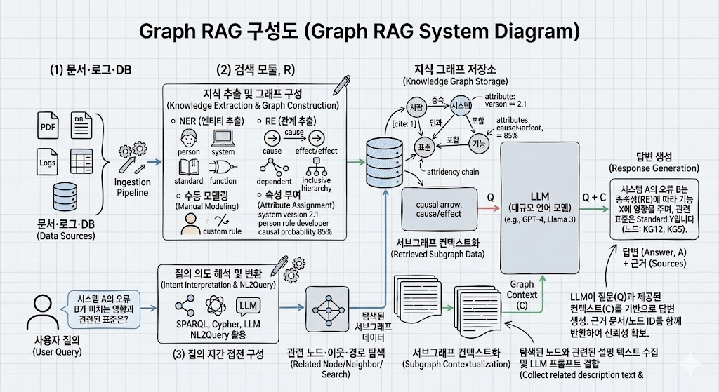 | 데이터 구조 | 문서·텍스트·DB 등 다양한 외부 지식 소스 전체를 포괄 | 평면 텍스트 청크 + 임베딩 벡터 인덱스(FAISS, HNSW 등) | 노드(엔티티)·엣지(관계)로 구성된 지식그래프(KG, property graph 등) |