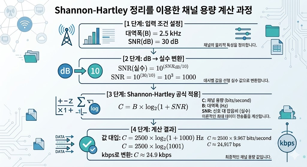 - 주어진 조건(B=2.5kHz, SNR=30dB)에서 오류 없는 최대 전송속도는 약 24.9kbps임