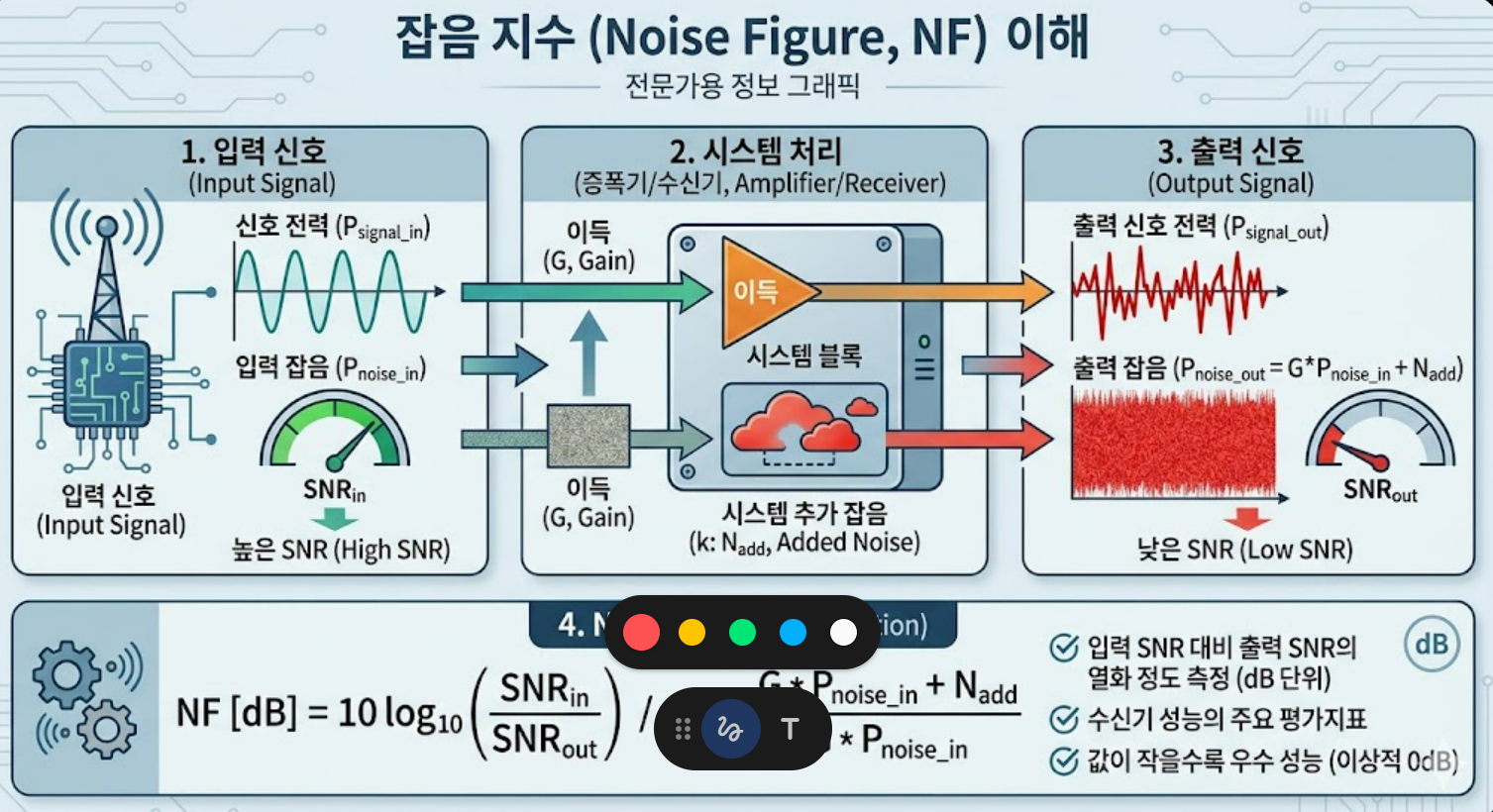 - 수신기 또는 증폭기가 신호를 처리하는 과정에서 추가하는 잡음량을 나타내는 지표