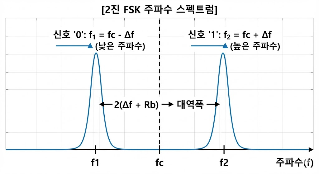 ㅇ 개념: FSK 신호의 대역폭은 카슨의 법칙(Carson's Rule)에 따라 주파수 편이(Δf)와 비트율(Rb)에 의해 결정