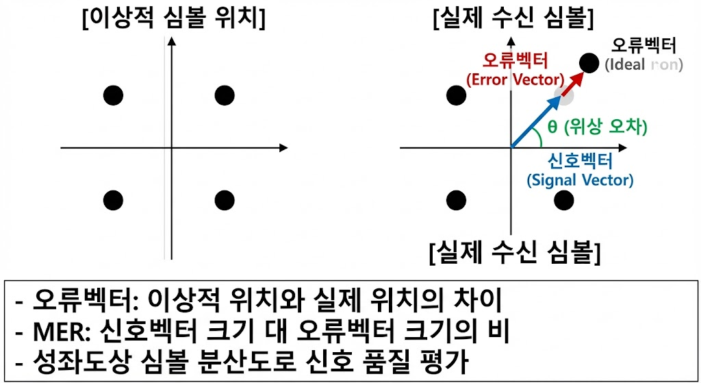 | 포괄적 측정 | 잡음, 반송파 누출, IQ 진폭 불균형, 위상 잡음 등 모든 신호 손상 포함 | 종합 품질 지표 |
