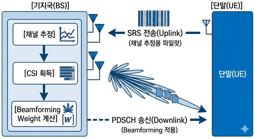 - BS는 UE의 SRS(Sounding Reference Signal) 수신으로 UL 채널 추정 후 동일 채널 특성 활용하여 DL Beamforming 수행