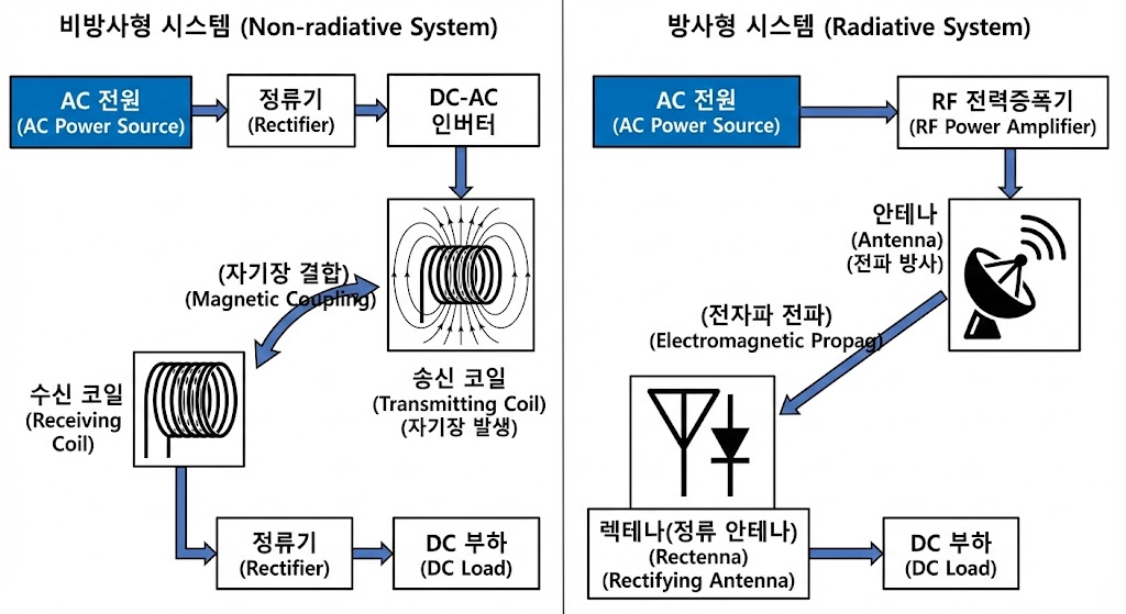- 비방사형: 근거리 자기장 또는 전기장의 결합을 이용한 전력전송 방식으로, 전자파가 공간으로 방사되지 않음